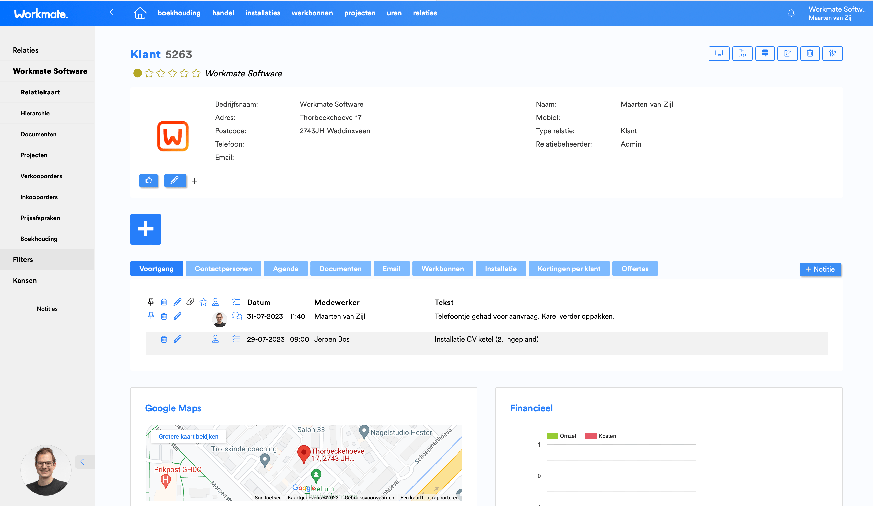Alle gegevens in Workmate zijn centraal terug te vinden op de klantkaart. Zo raak je nooit meer een notitie of document kwijt. Ook kun je vanaf hier snel een offerte of handmatige factuur aanmaken.